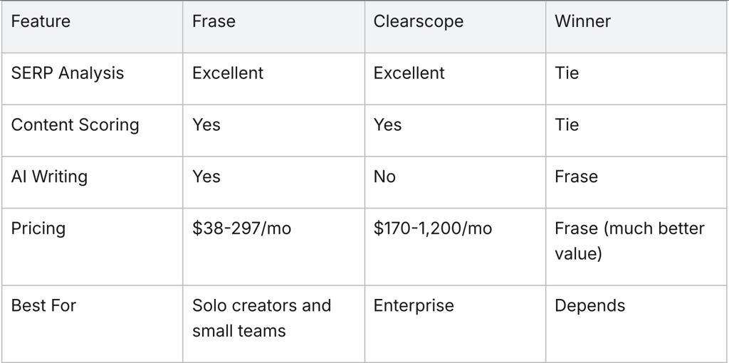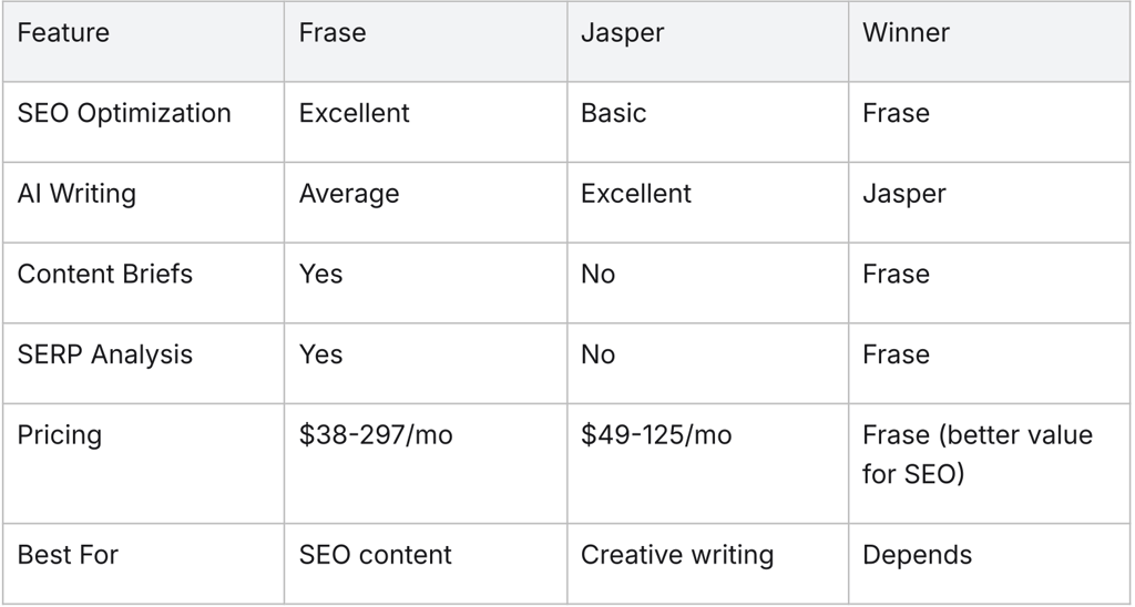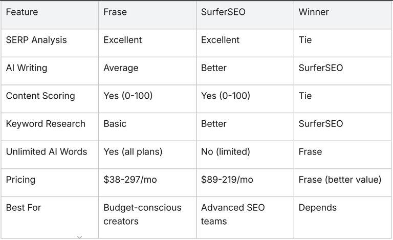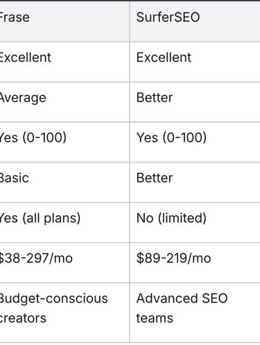 Frase's SERP analysis and Content Optimization are best-in-class. The unlimited AI words on all plans and affordable pricing ($38-98/mo for most users) make it better value than competitors like SurferSEO ($89+/mo) and Clearscope ($170+/mo).