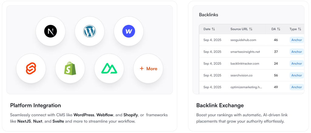 CMS integrations are well-built. Direct publishing to WordPress, Webflow, and Shopify means less friction in the content workflow. The NextJS and framework support is especially notable for more technical teams.