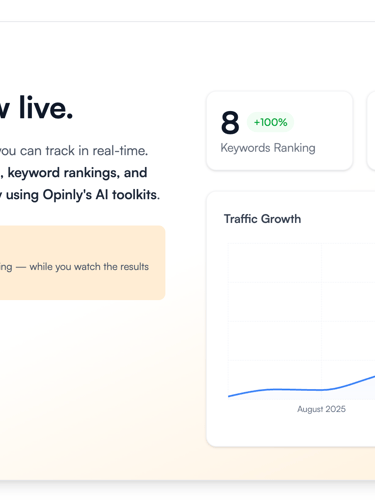 It replaces multiple tools. If you're currently paying for separate keyword tracking, competitor analysis software, content optimization, and backlink monitoring tools, Opinly consolidates all of that. Some users report replacing $1,500+/month in agency fees or $3,000+/month across multiple SEO optimization tools.