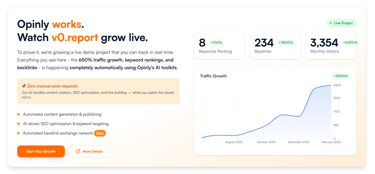 The live demo project is smart. Opinly runs a public demo site (v0.report) where you can see their AI growing traffic in real-time. They claim 650% traffic growth, 3,800% increase in keyword rankings, and 5,490% growth in backlinks — all automated. It's a great transparency move that builds trust.