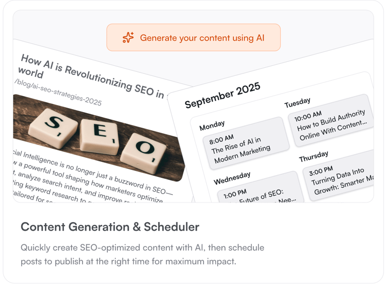 This is one of Opinly's biggest selling points. The platform generates SEO-optimized content using AI, then lets you schedule it to publish directly to your CMS. It handles topic clustering, keyword targeting, and internal linking as part of the generation process.