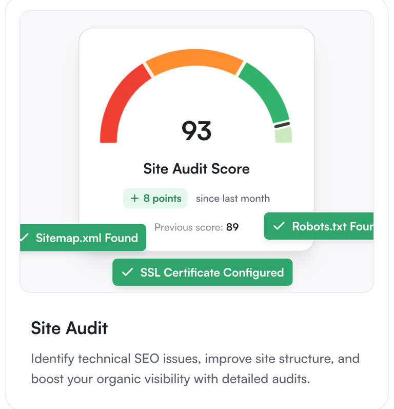 Opinly crawls your site to identify technical SEO issues — broken links, indexation problems, Core Web Vitals, and site structure. It doesn't just flag the problems, it suggests fixes and prioritizes them based on impact. Think of it as a lighter version of Screaming Frog that runs automatically in the background.
