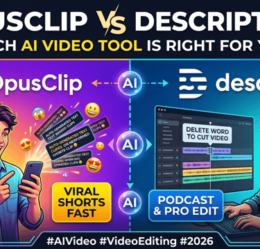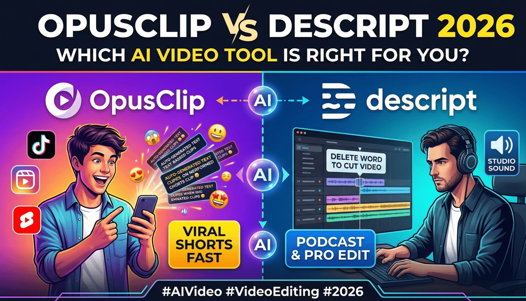 If you're a content creator trying to keep up with short-form video in 2026, you've probably come across both OpusClip and Descript. They both use AI, they both handle video, and they both promise to save you time. But they're actually very different tools built for very different workflows.