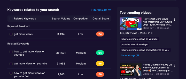 This is vidIQ's bread and butter. The keyword research tool helps you find exactly what people are searching for on YouTube.